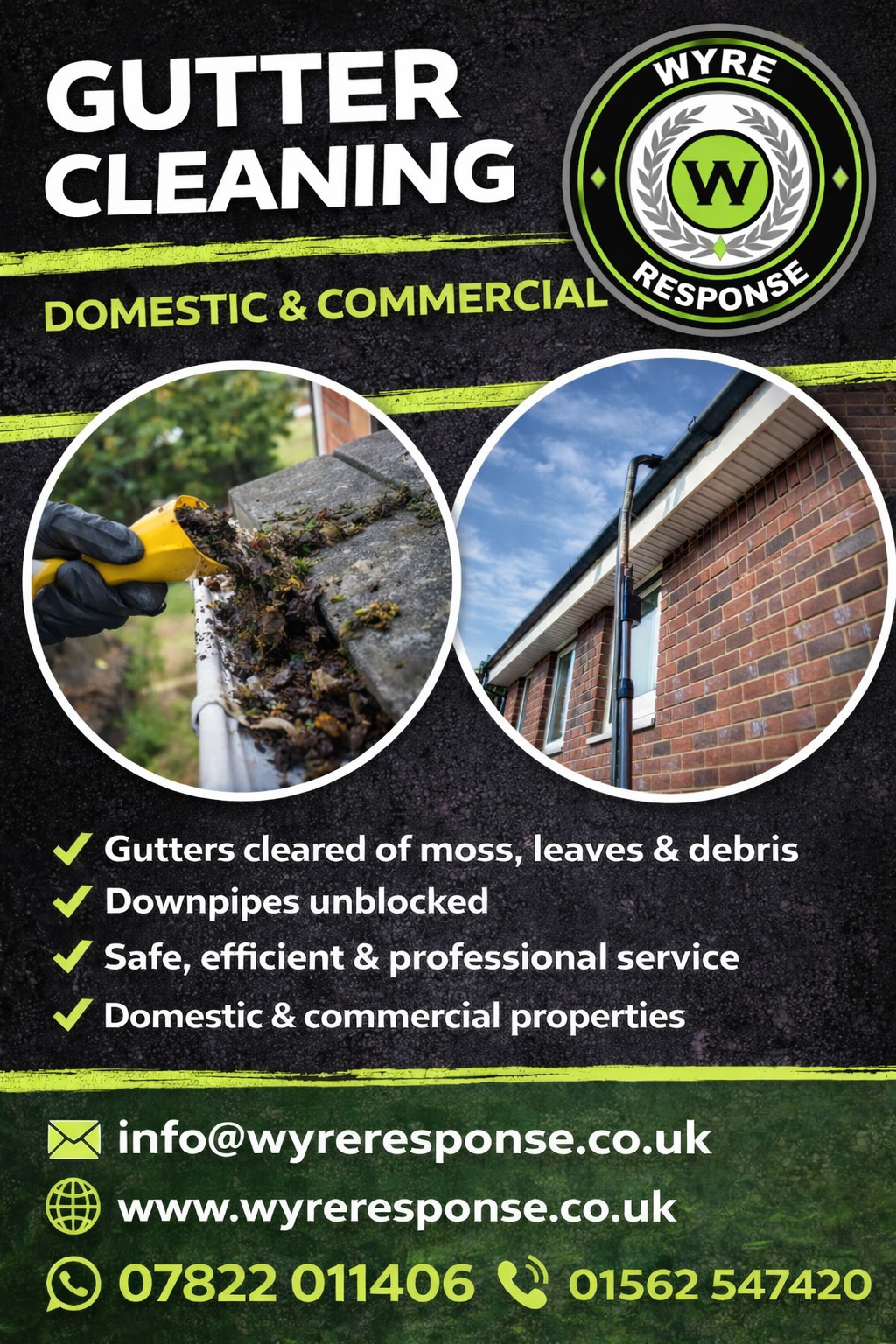At Wyre Response Specialist Cleaning Services, we provide professional gutter cleaning for domestic and commercial properties, helping protect buildings from water damage, blockages, and long-term structural issues. Regular gutter maintenance is essential to ensure rainwater is safely directed away from your property.